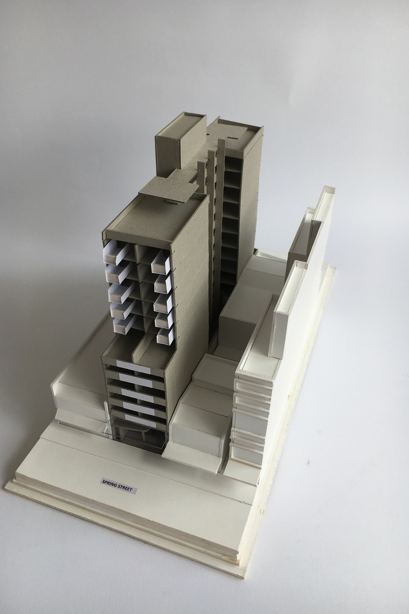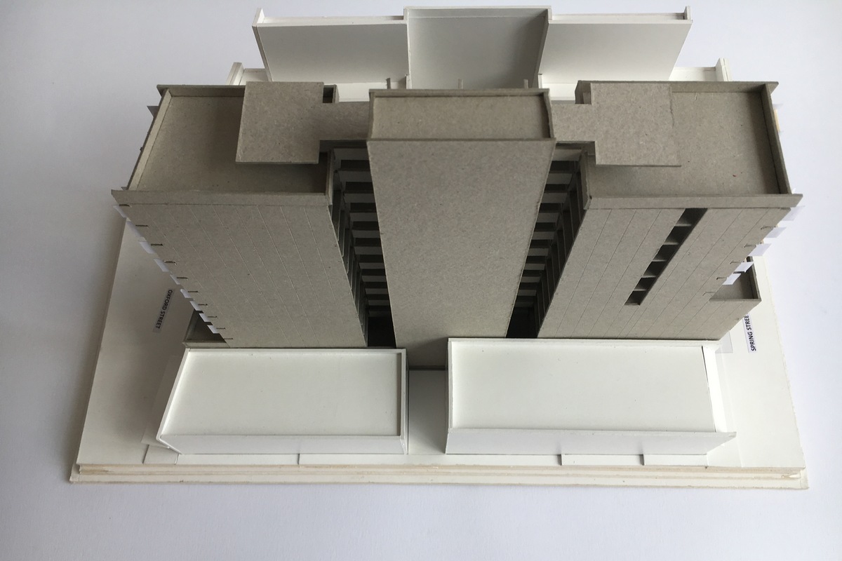 - Two residential towers addressing both Oxford and Spring Streets