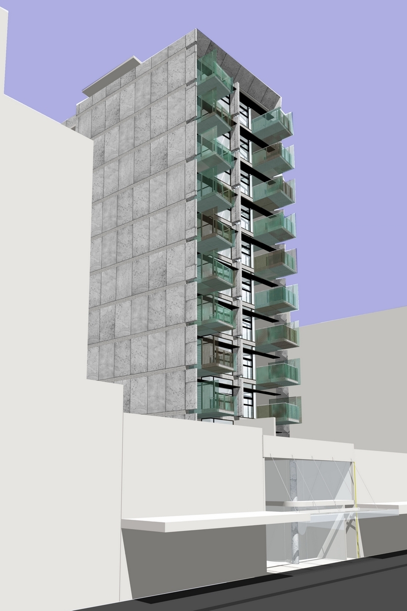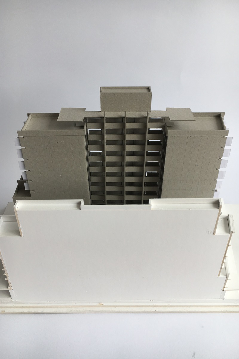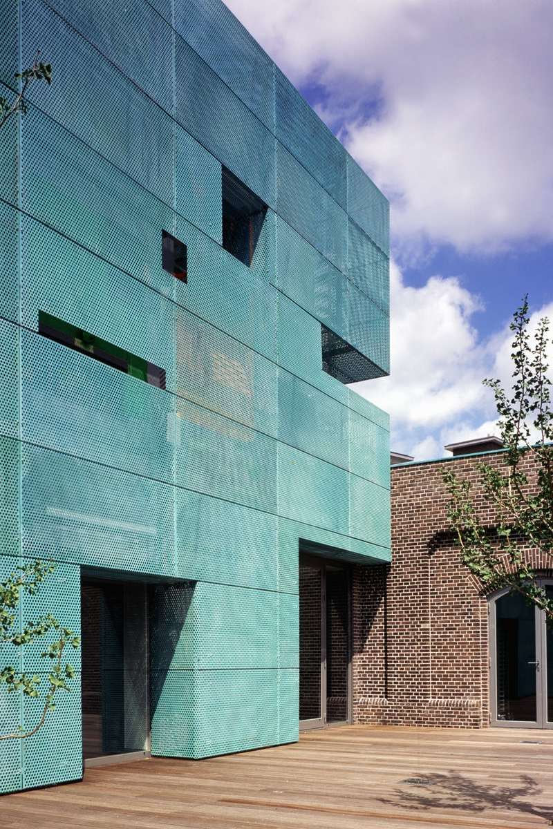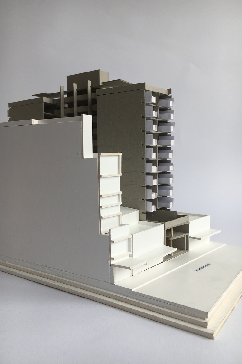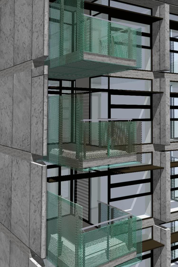 The main structure is raw and constructed from off-form concrete, contrasted by fine glazing fenestration and the protruding balconies constructed from perforated copper. The copper will naturally oxidise over time to create a pixelated pattern and texture to these protruding, transparent elements. This will provide a sense of balance, a visual and textural contrast to the concrete bulk.
