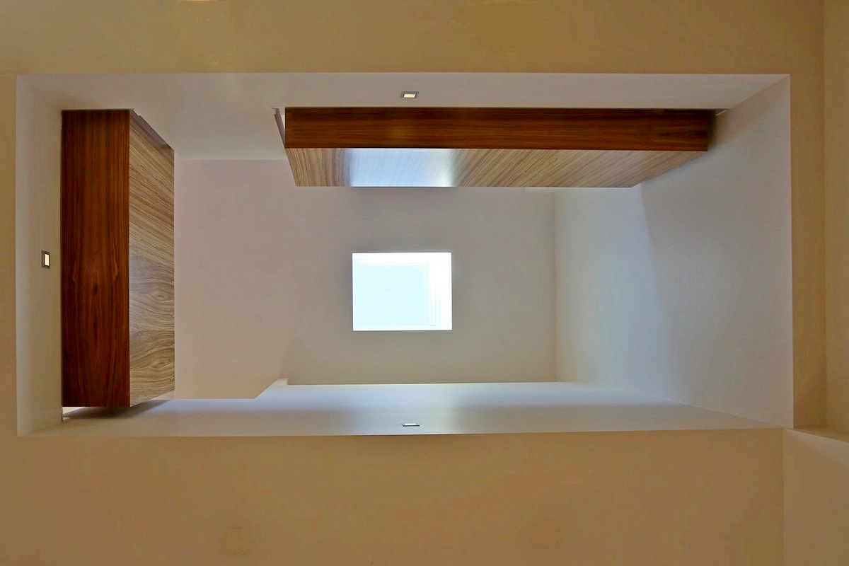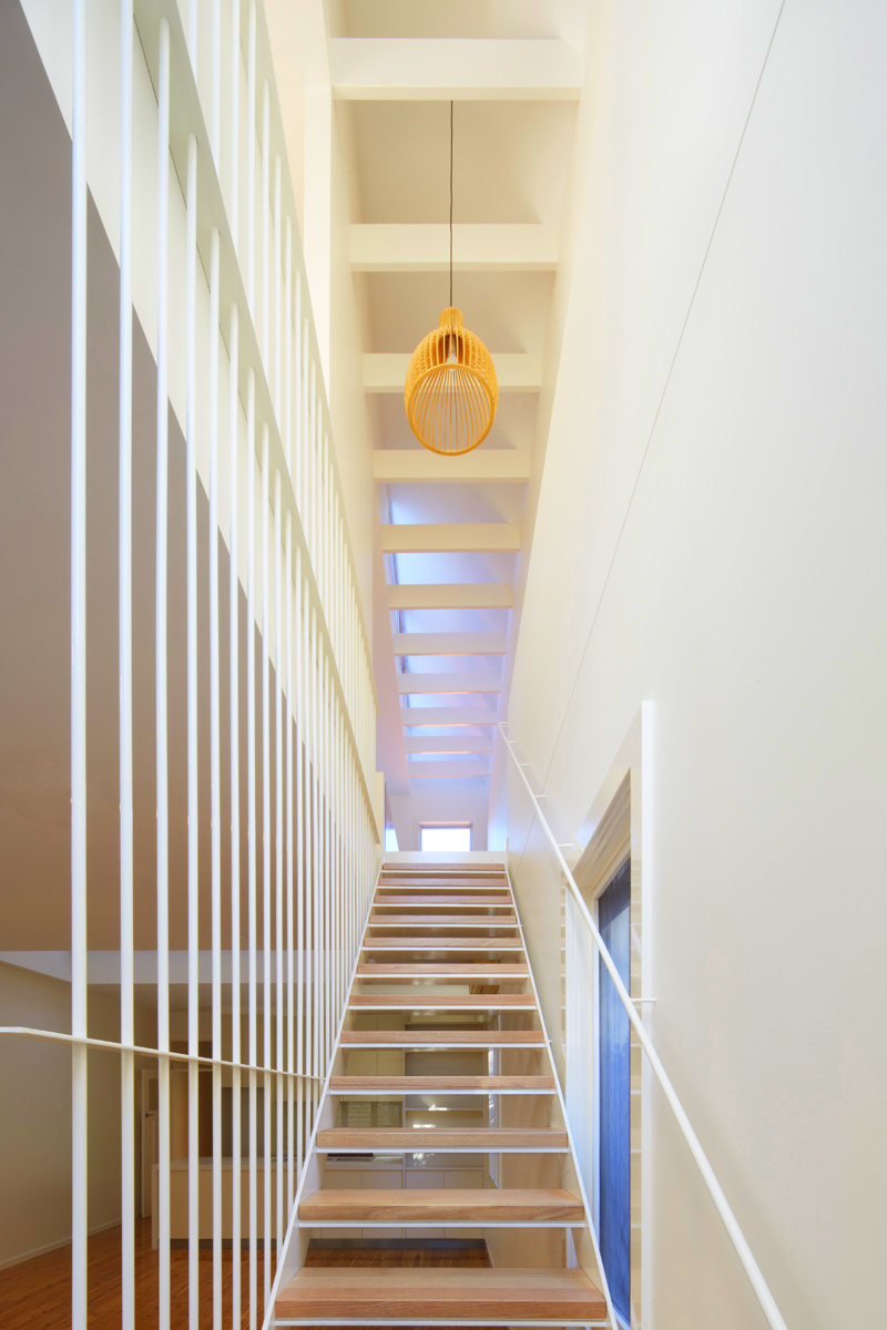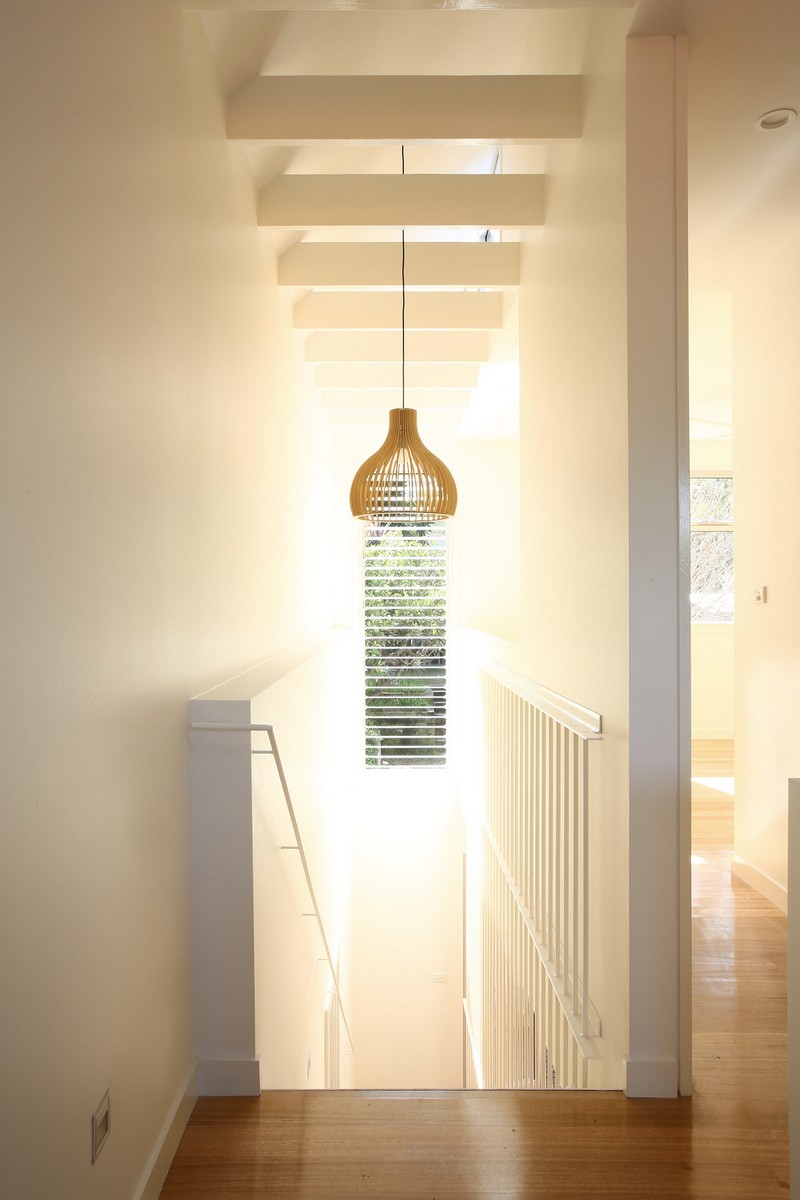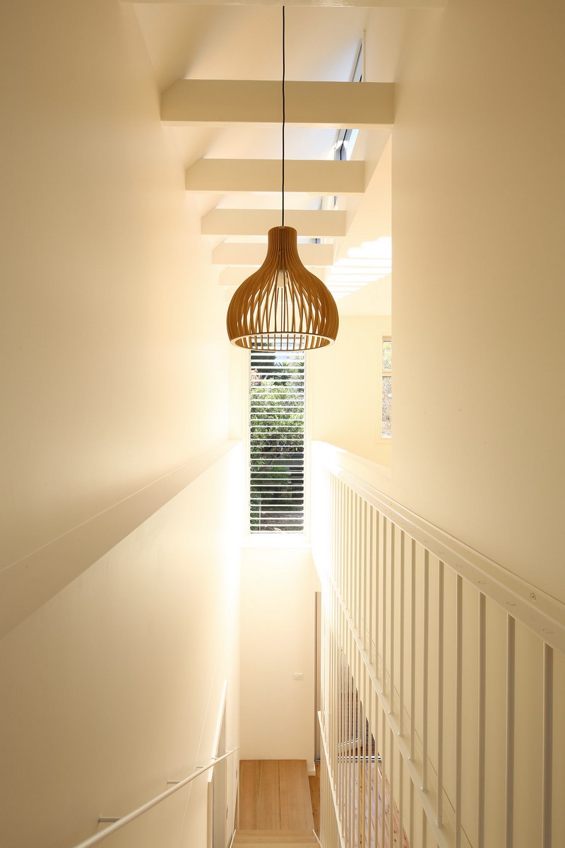 The stair is a light and airy element constructed from fine white-painted steel plate, allowing for the light above to flow downstairs.
