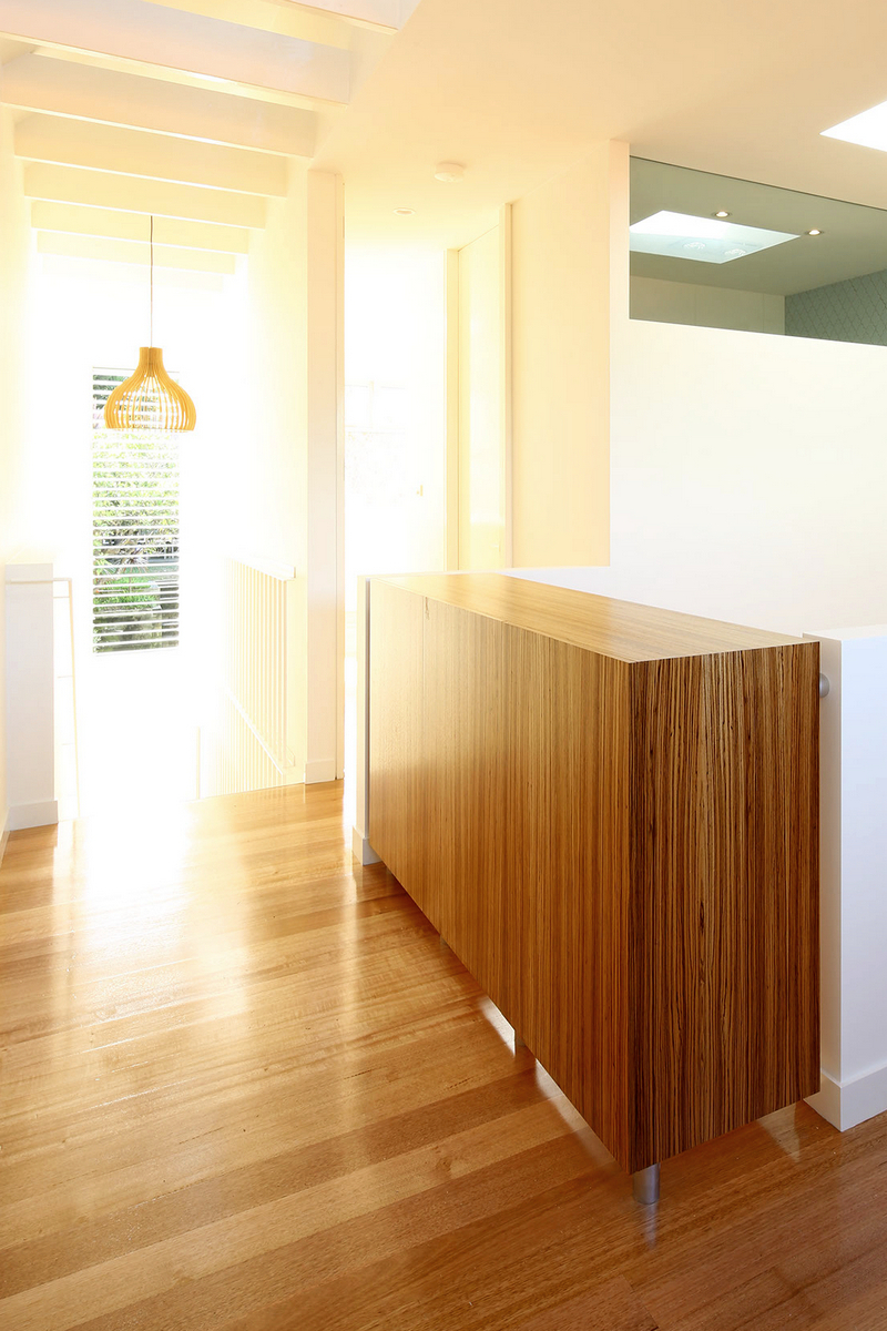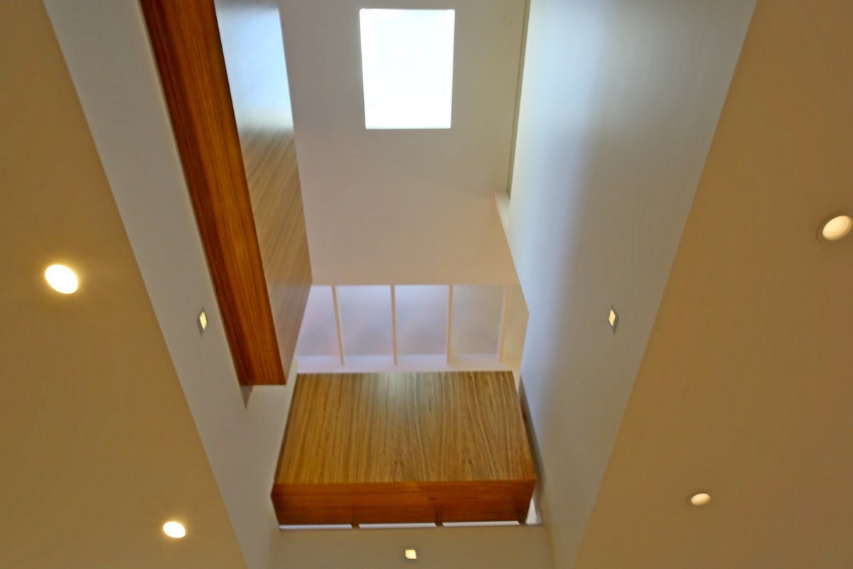 A large east-facing clerestory story window is created above the entire western first-floor corridor zone, capturing the morning eastern light and directing it into the house via the void and stairs. A skylight directly over the void channels sunlight into the centre of the house at midday. The northern windows capture the northern light throughout the day