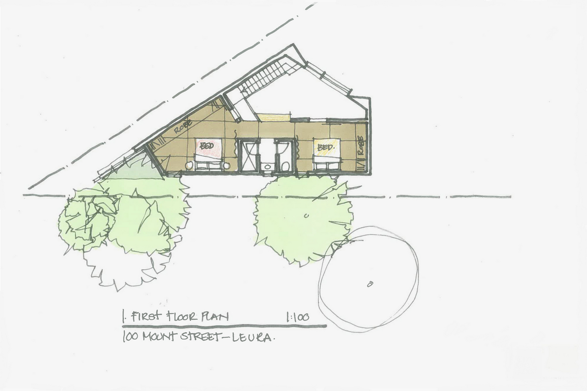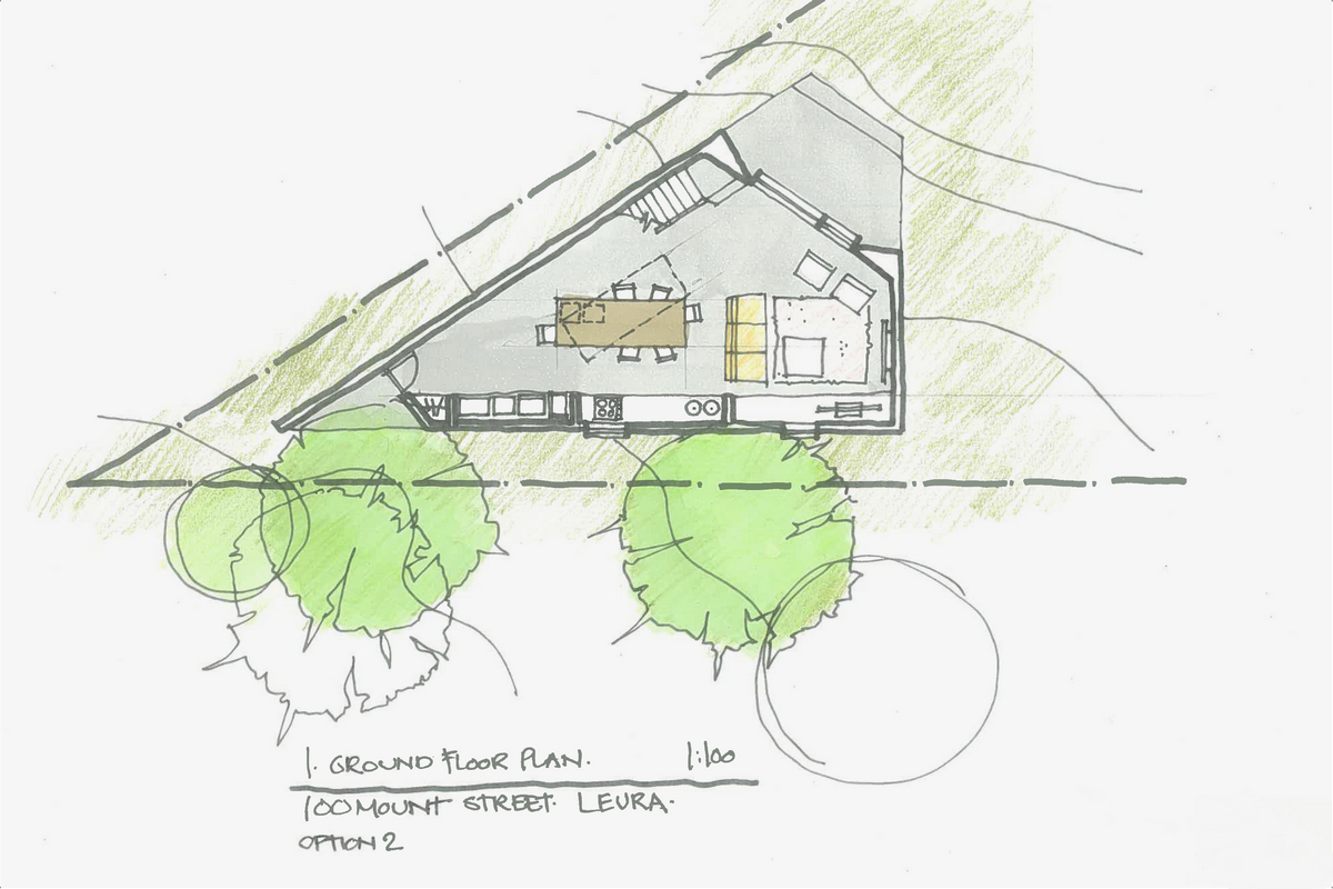 The site conditions have dictated the planning of this structure, which is triangular in shape and wedged between the front and side boundaries, a small creek and a Sydney Water sewer main. This is the only allowable buildable area on a 5,000sq m site.