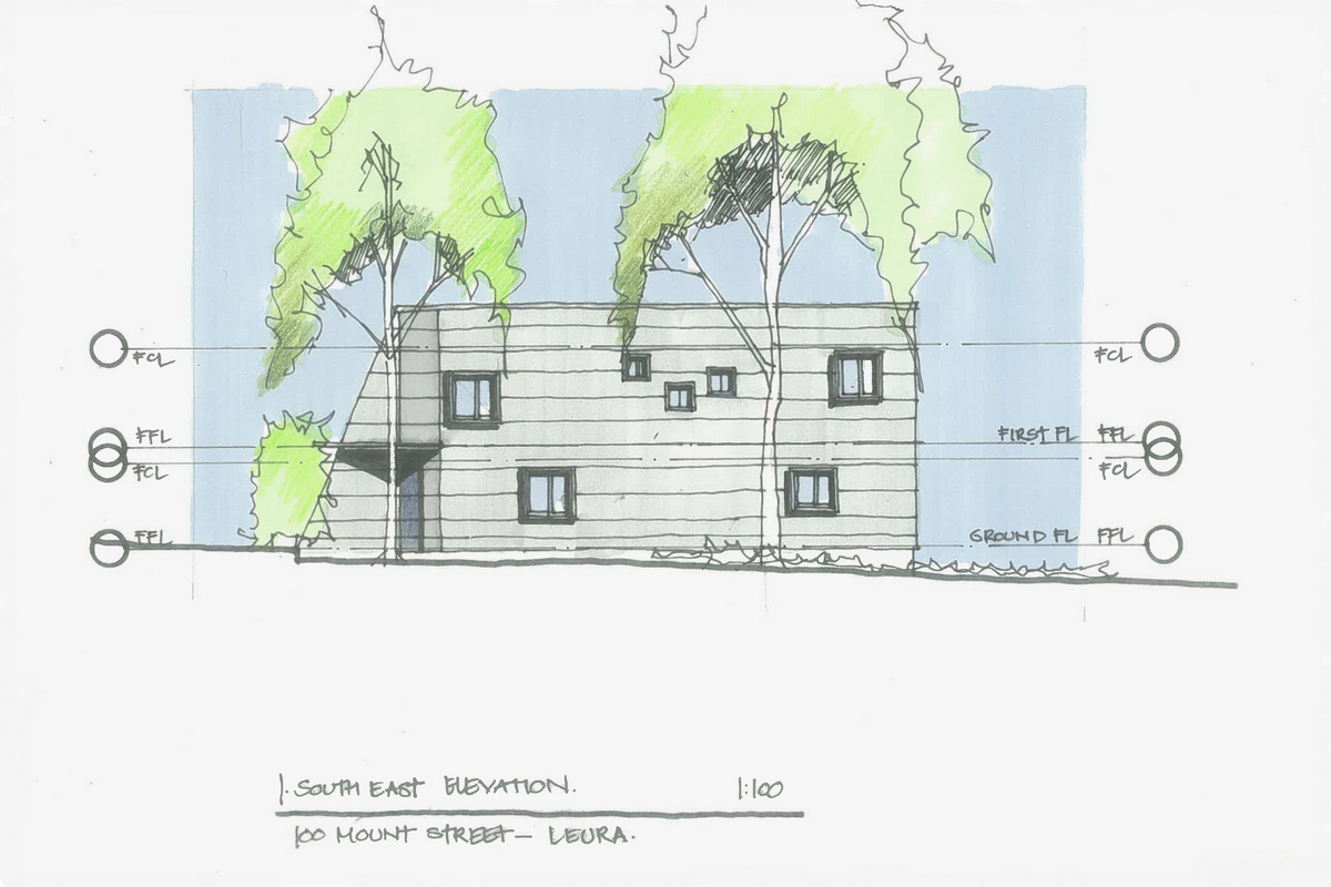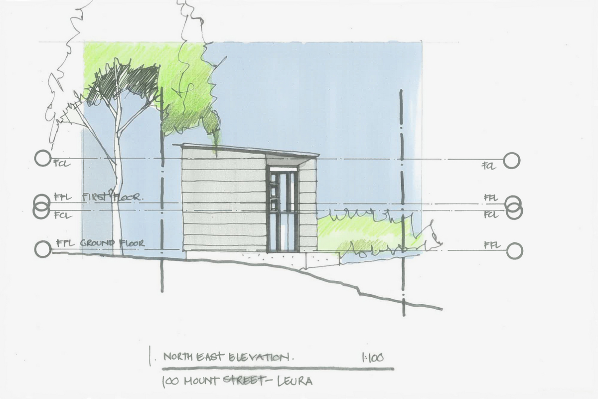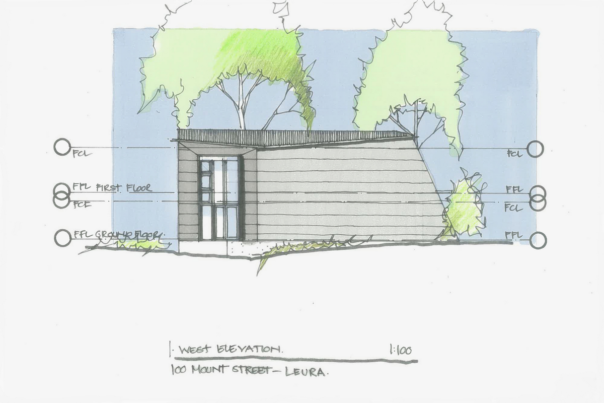 Due to the bushfire flame zone location, the house is required to use particular materials in the build. These include a concrete slab floor (due to the cost restrictions, this will also become the internal floor finish) and exterior cladding in UBIQ (magnesium oxide cement panel), which is low in CO2 emissions, and finished with clear sealant to appear as concrete. The large window to the north, facing bushland, has a steel and aluminium frame and is protected by a fire shutter; the smaller window to the southeast is framed in aluminium and will have mesh screening.