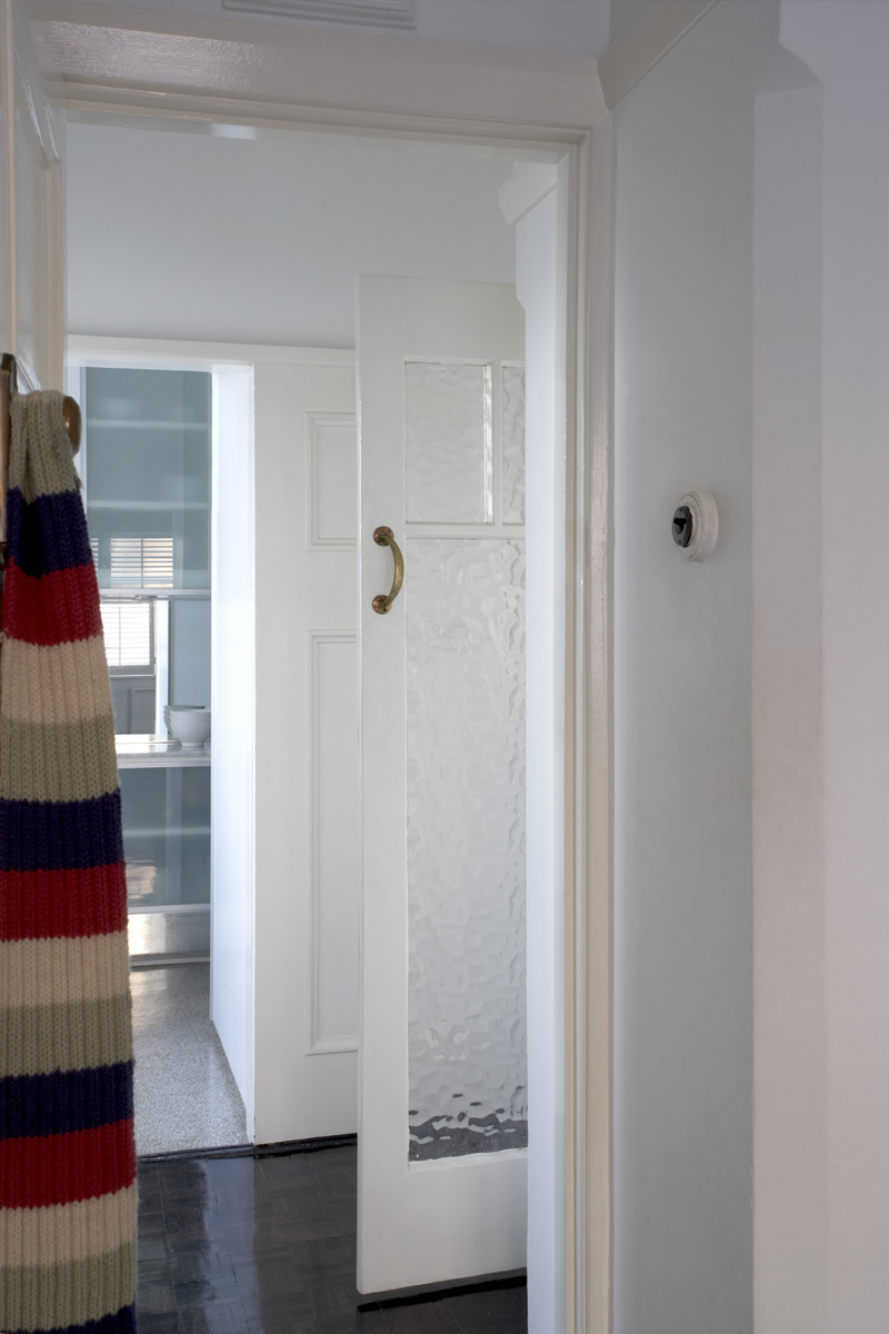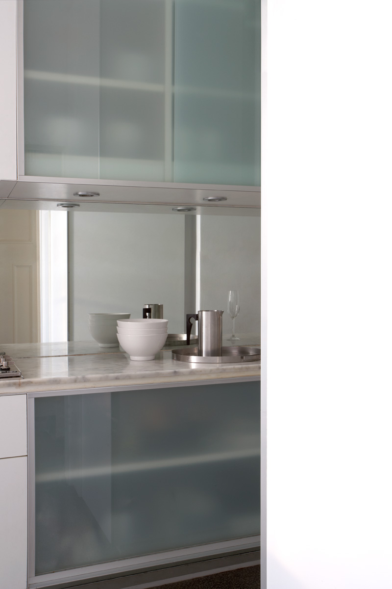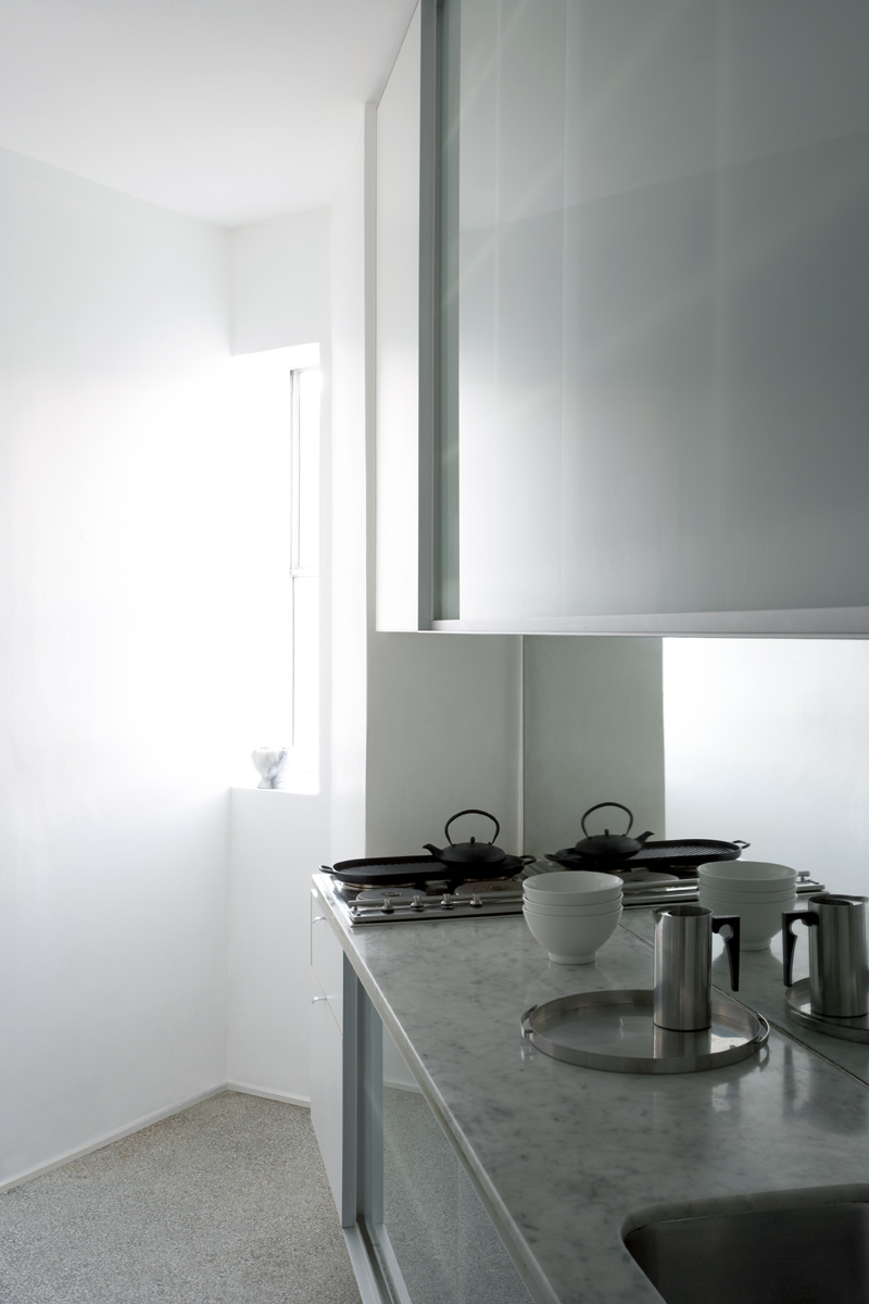 The soft green of the new glass-fronted cabinets complement the existing terrazzo floor. A monochrome palette of materials and colours is utilised to highlight the elegant proportions and details of the existing apartment.