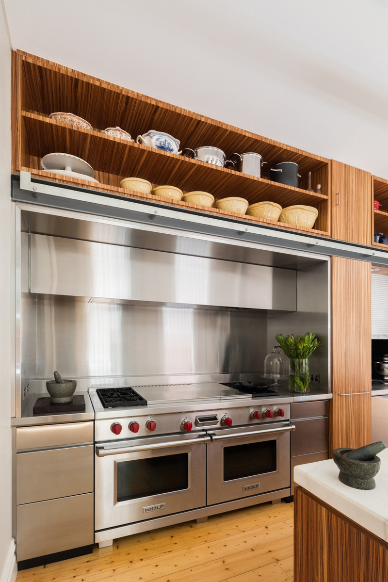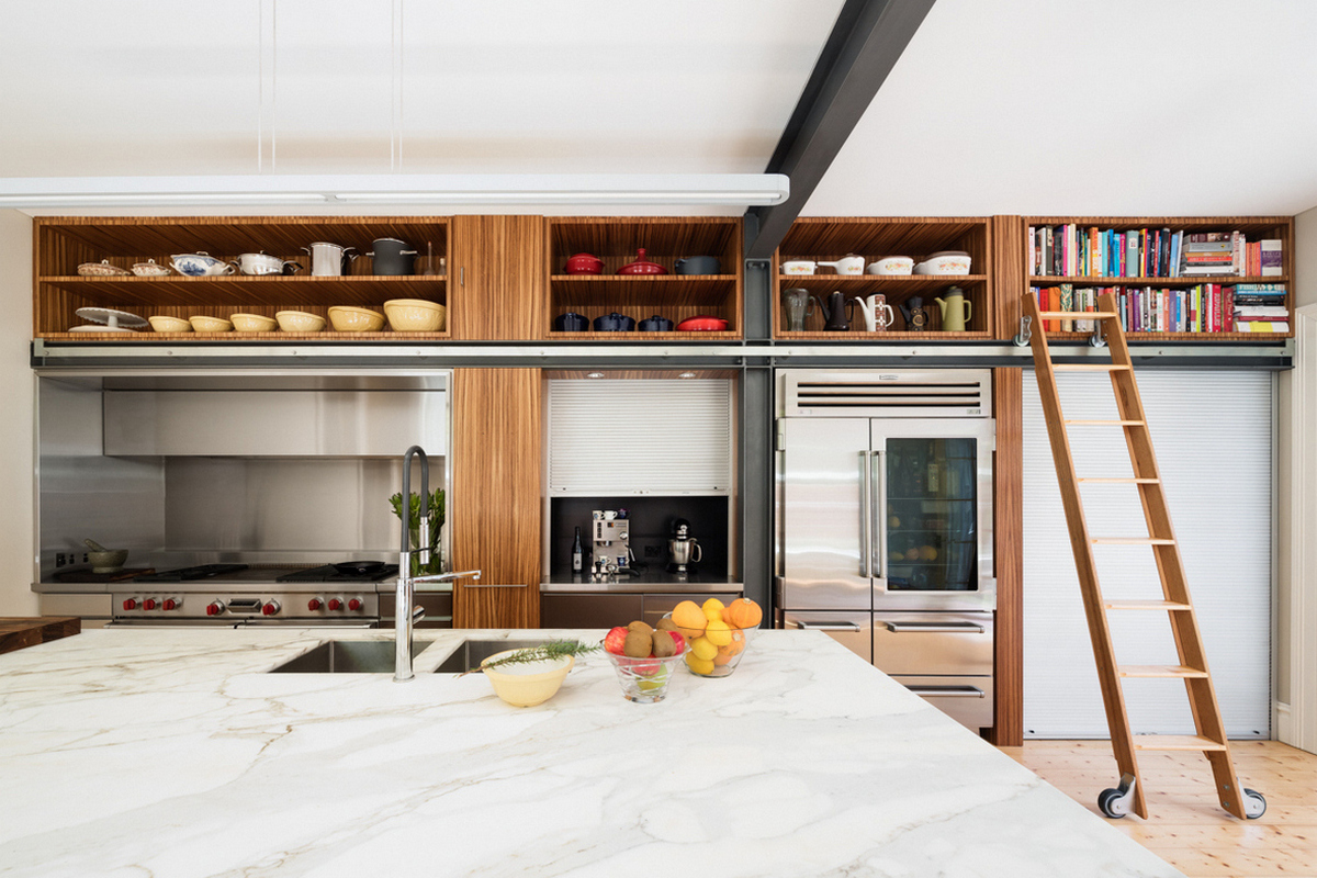 Industrial items, appliances and finishes are used to enforce the functionality of each element, such as aluminium roller shutters to cover the appliance cupboard and laundry area, industrial cooker, oven and fridge and stainless steel lining are used for surfaces around the both cooking and appliance areas. Timber and marble are added to contrast and soften the robust mechanical finishes and add warmth and texture.